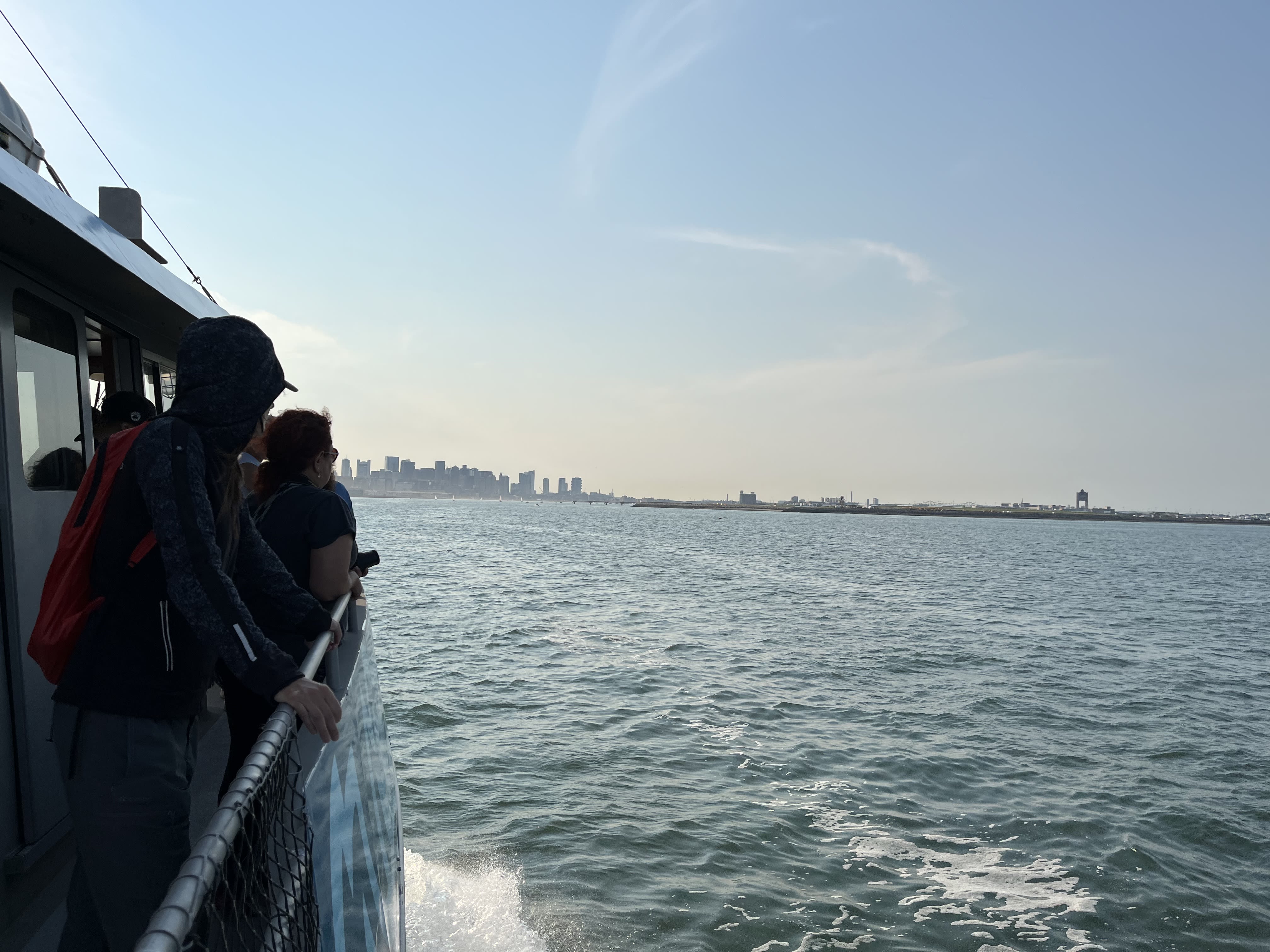 People watch the Boston skyline come into view after taking a boat ride out to the Boston Harbor Islands.