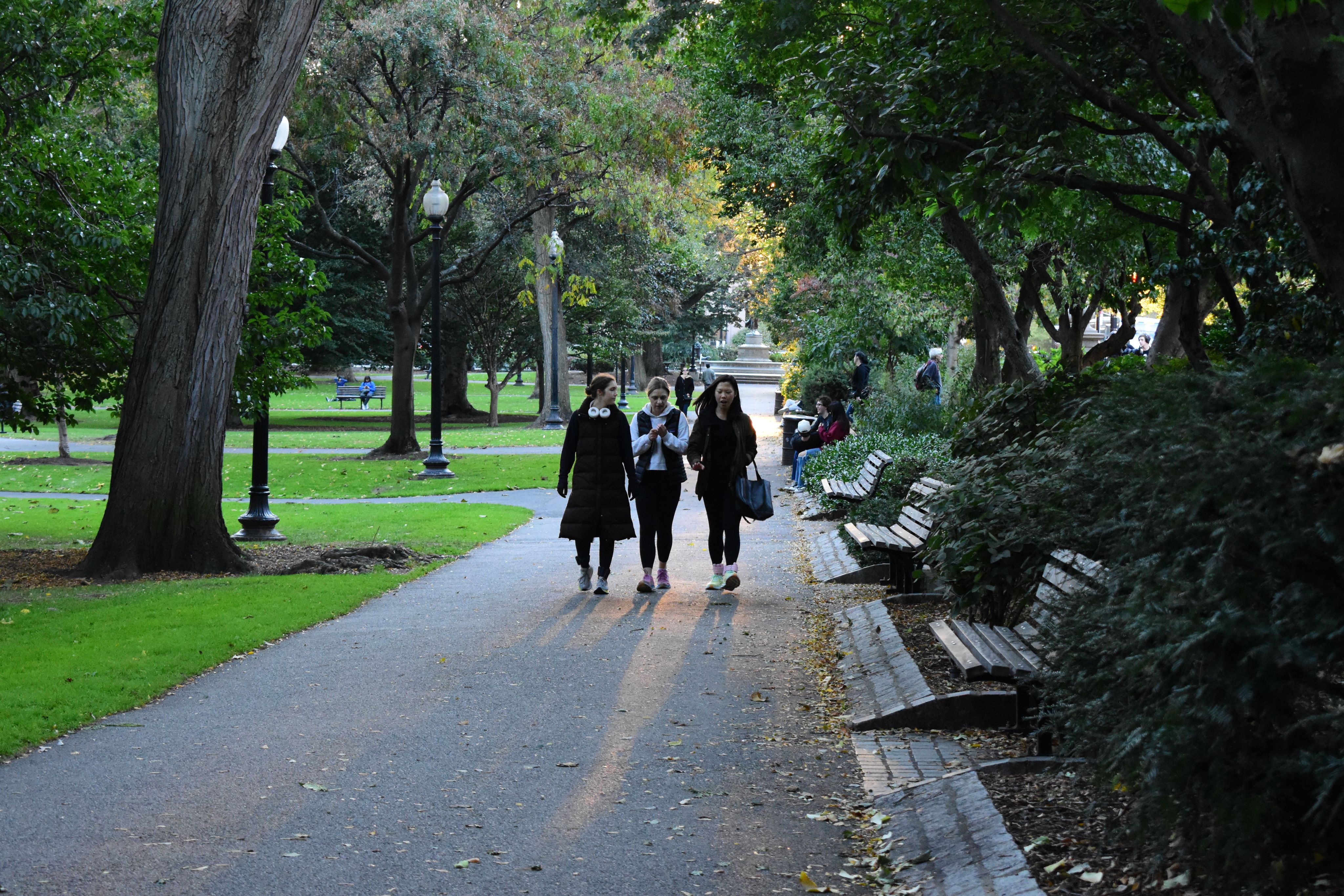Three friends stroll through the Boston Public Garden, deep in conversation.