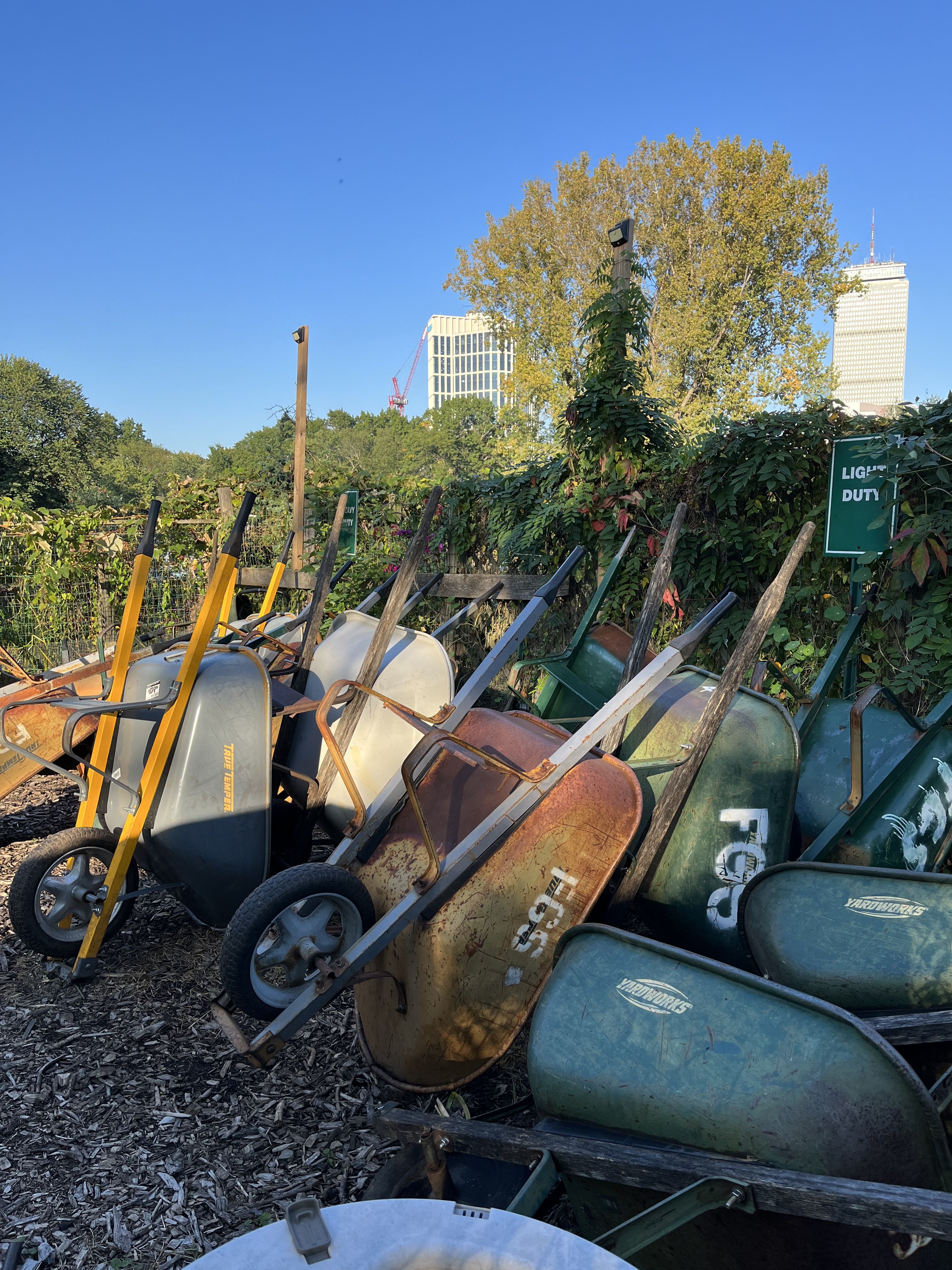 The Fenway Garden Society provides wheelbarrows that can be used by any of the 400 gardeners that have a plot in the Fenway Victory Gardens.