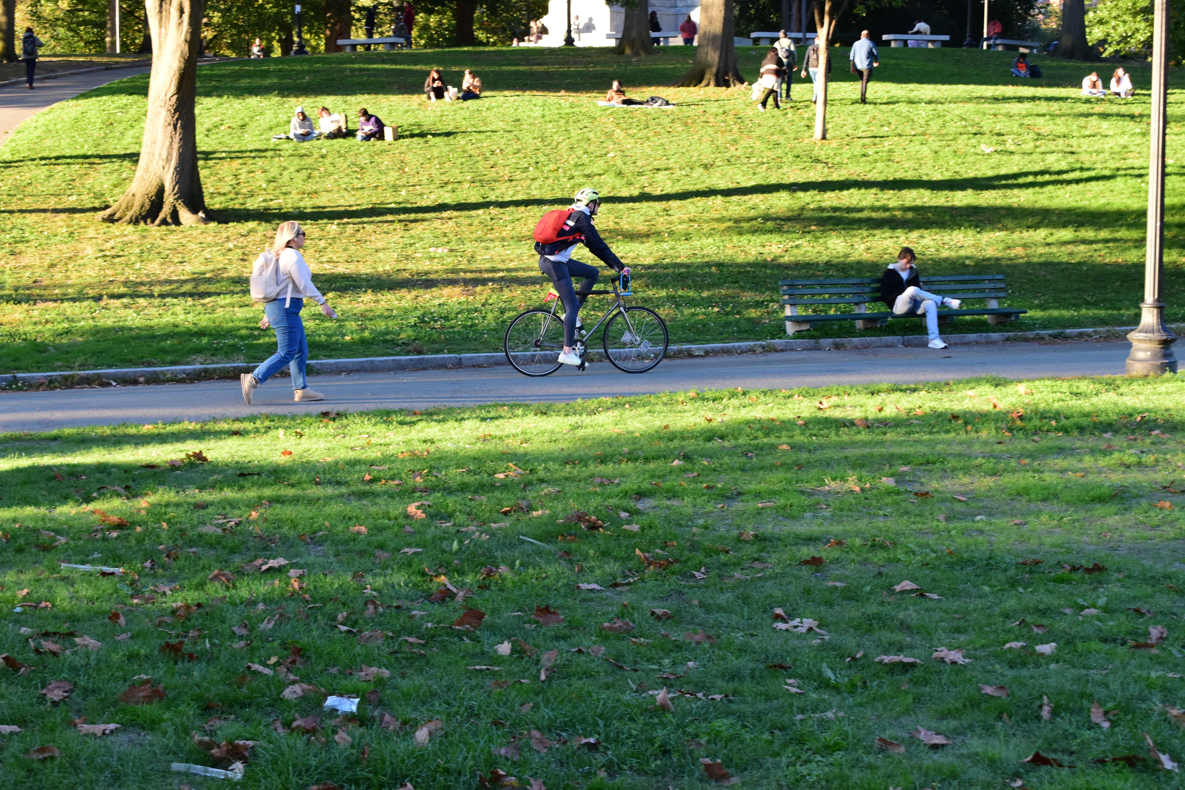 A man bikes through the Boston Common at the end of the work day.