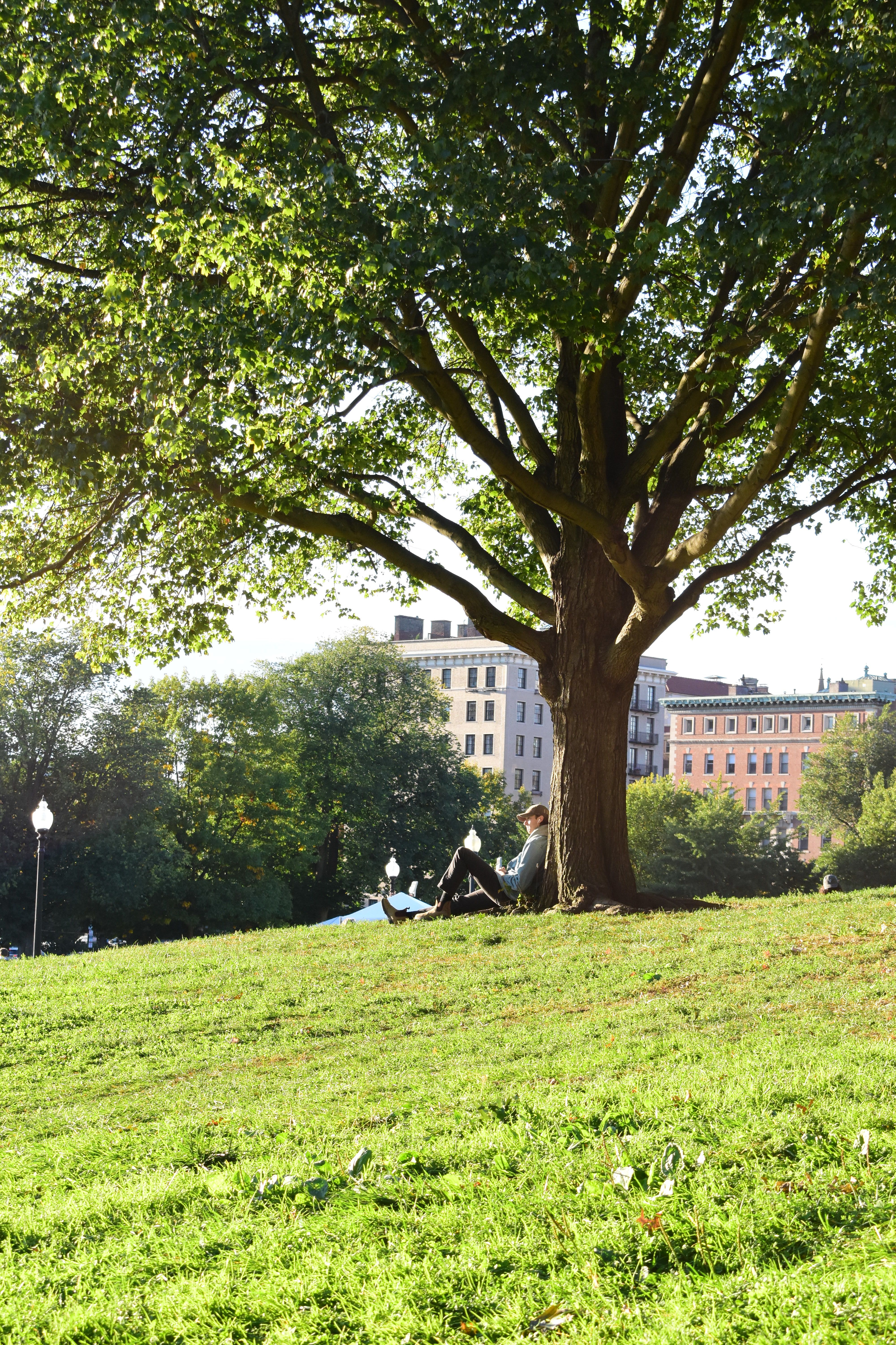 A man rests against the trunk of a tree in the Boston Common, enjoying one of the last warm days of fall.